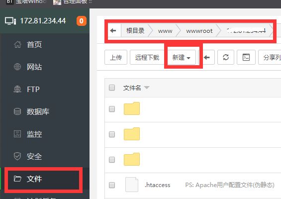 • 打开宝塔面板,选择文件,找到相应的目录,在相应IP目录下新建文件夹;比如我刚刚写的版本代号是a,那我就新建a这个文件夹